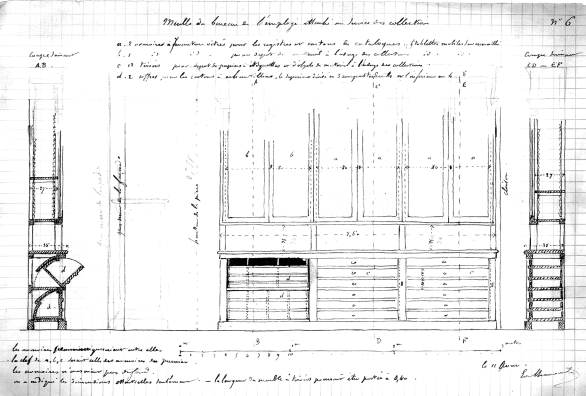 Comme l'écrit son collègue et ami, Philippe-Jacques-Edmond Fuchs (1837-1889) (4), les publications du jeune ingénieur attirèrent sur lui " l'attention de ses chefs et celle de l'Administration supérieure ". Après avoir passé trois ans en province (1845-1848), chargé successivement des arrondissements miniers de Mézières, Orléans et Nantes, il fut rappelé à Paris pour y enseigner la topographie et y organiser, sous la direction de Frédéric Le Play, la collection des gîtes minéraux et celle de la Statistique minérale de la France. C'est le moment où, après plus de trente années de travaux, l'École des mines est enfin dans ses murs, l'hôtel de Vendôme, amputé de sa cour d'honneur par le percement du boulevard Saint-Michel, ayant été augmenté vers le jardin du Luxembourg par un bâtiment triplant sa surface initiale. Alexandre de Chancourtois va vite déployer une activité débordante, veillant au moindre détail concernant l'aménagement des pièces et l'organisation des collections. En 1960, lorsque le musée actuel s'est installé à l'emplacement de l'ancienne collection départementale de Statistique, on a pu mesurer le soin extrême avec lequel il s'était acquitté de sa tâche. On a ainsi retrouvé les plans, extrêmement détaillés et entièrement rédigés de sa main, des meubles de rangement et d'exposition (Fig. 2). Ce sont ces meubles (" réalisés en chêne de Hongrie "), simplement modifiés par l'adjonction de quelques vitrines et, malheureusement, la suppression de tiroirs basculants pour ranger de gros échantillons, qui sont encore utilisés aujourd'hui, faisant l'admiration de tous les visiteurs.