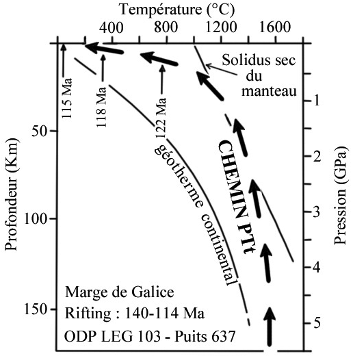 Le " chemin pression température " de la roche (Fig. 3) fut établi par Jacques Girardeau et ses collaborateurs, parmi lesquels Marie-Odile Beslier, alors doctorante, et par Gilbert Féraud, puis par Urs Schärer, qui en ont daté les principales étapes. Suivant ce chemin, la roche, issue du manteau sous-continental, après une brève incursion dans le champ de la fusion partielle vers 25 km de profondeur (7 % d'extraction de magma), en est sortie vers -7 km il y a un peu plus de 120 Ma, et a atteint la surface vers -115 Ma. Replacée dans l'évolution de la marge établie par les forages dans la série sédimentaire, l'ascension des péridotites est contemporaine du " rifting ", et s'est achevée au moment de la rupture continentale, à l'Aptien-Albien. La dernière partie de l'évolution, notamment la serpentinisation, est affaire d'échange avec l'eau de mer (hydrothermalisme, puis altération superficielle à la mise à l'affleurement).