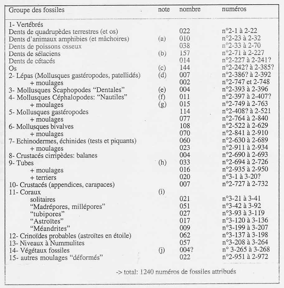 On a distingué la numérotation du volume 2 (n° 2-n) et du volume 3 (n° 3-n). La citation des spécimens n° 2-733 à 2-746 n’a pas été localisée. (a) dents et mâchoires de reptiles, de mammifères (surtout cétacés) ; (b) requins et raies ; (c) os du crâne, vertèbres, côtes, membres de cétacés, oiseaux ; (d) attribution difficile ; (e) vraisemblablement 4 groupes et non 4 spécimens ; (f) Borda d’Oro inclut les ordres des Nautiles et des Ammonites ainsi que des foraminifères benthiques nommés « Nautiles microscopiques » ; (g) Ordres des Nautiles et des Ammonites; (h) nature incertaine: vers, serpules, terriers ou coquilles ; (i) sous le nom de polypiers sont rassemblés des membres de l’embranchement des Coraux mais aussi des éponges (silicifiées) ; (j) il s’agit de restes de bois, de cônes de gymnospermes, de tourbe, de lignite.