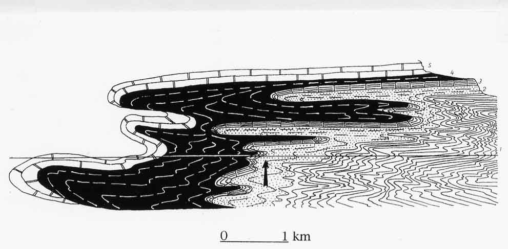 2. Les microplis compliqués ont été produits par la cristallisation au fond de la mer et ensuite incorporés dans le plissement principal ultérieur. Cette hypothèse vraiment périmée, mais tenace dans l'évolution de sa pensée, contredit le fait que ces couches sont surtout schisteuses, donc de vrais sédiments. De ce fait l'idée de la cristallisation est inapplicable.