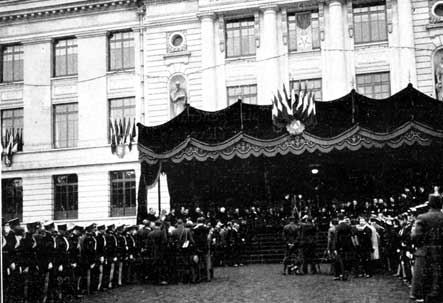 La cérémonie, émouvante et simple, s'est déroulée à trois heures de l'après-midi dans la grande cour d'honneur de l'Ecole, récemment reconstruite cours Fauriel, suivant un plan d'une magnifique ampleur.
