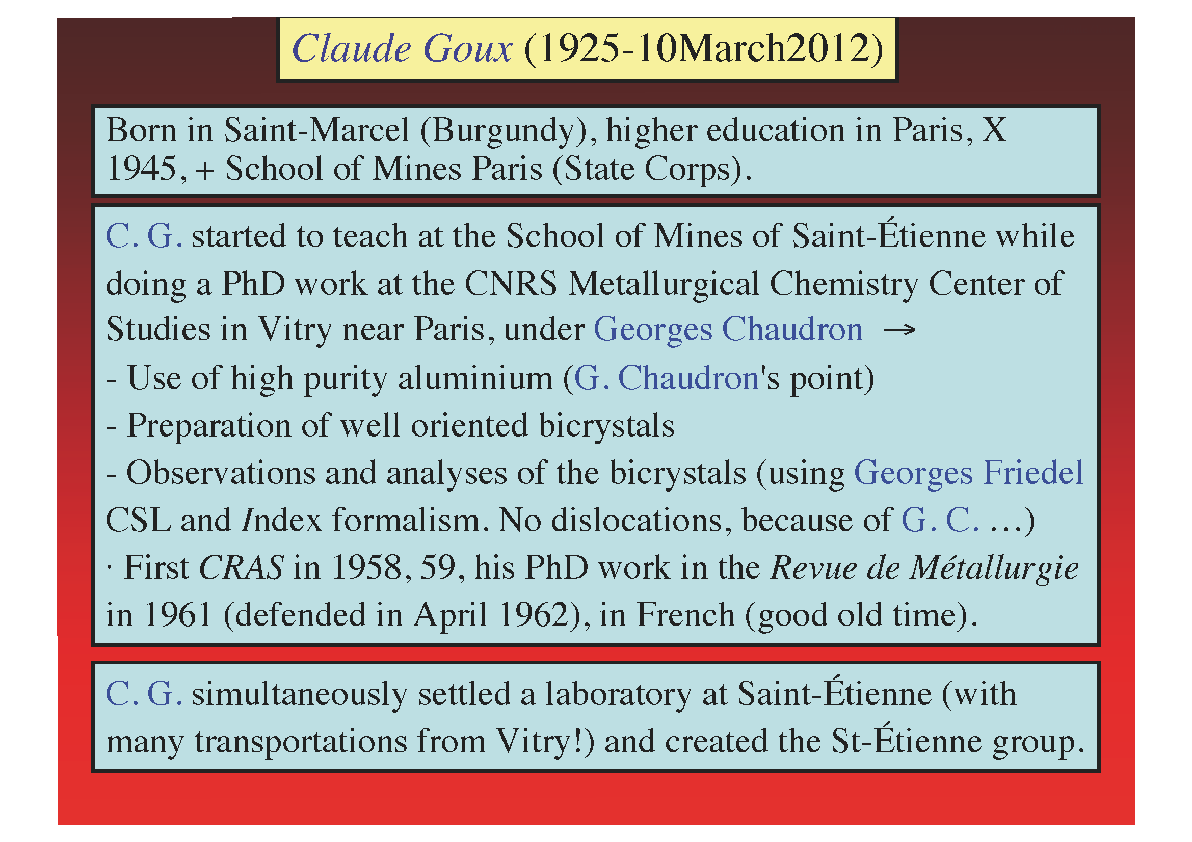 Sur proposition de Claude Goux, Jacques Lévy prit sa succession en 1973 comme directeur du Centre de métallurgie de l'Ecole des mines de Saint-Etienne, Claude Goux souhaitant prendre du recul pour étudier les résultats de R. von Mises et G.I. Taylor sur le nombre de systèmes de glissements nécessaires pour une déformation facile dans les polycristaux.