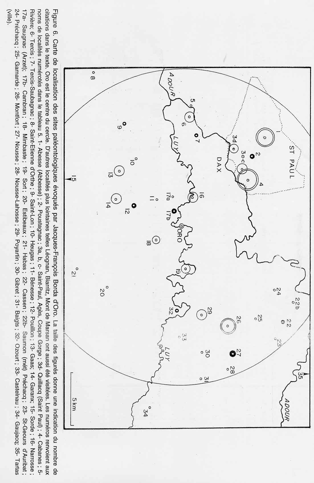 Figure 6. Carte de localisation des sites paléontologiques évoqués par Jacques-François Borda d'Oro. La taille des figurés donne une indication du nombre de citations dans le texte. Oro est le centre du cercle. D’autres localités plus lointaines telles Léognan, Biarritz, Mont de Marsan ont aussi été visitées. Les numéros renvoient aux noms de localités numérotés dans le tableau 5. 1- Abesse (Abbesse) ; 2- Poustagnac ; 3a, b, c- Saint-Paul, Agès, Coupe Gorge ; 3d- Quillacq (Saint Paul) ; 4- Cabanes ; 5- Rivière; 6- Tercis ; 7- Tercis-Saubagnac ; 8- Saint-Etienne d’Orthe ; 9- Saint-Lon ; 10- Heugas ; 11- Bénesse ; 12- Pouillon ; 13- Gaas; 14- Garanx; 15- Sorde ; 16- Narrosse ; 17a- Saugnac (Arzet); 17b- Cambran ; 18- Mimbaste ; 19- Sort ; 20- Estibeaux ; 21- Habas ; 22- Cassen ; 22b- Saumon (mét) Préchacq ; 23- St-Geours d’Auribat ;