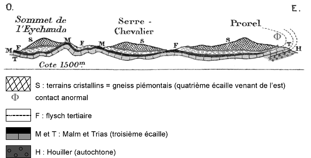 Figure 6. Interprétation des sommets de l’Eychauda, de Serre-Chevalier et de Prorel par Pierre Termier (modifié d’après Termier, 1899, p. 60).