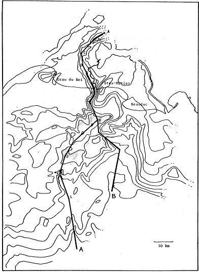 L'analyse d'enregistrements sismiques nous confirma dans nos travaux avec Lefebvre (1980) que le Rhône messinien, sur le continent et dans la même vallée qu'actuellement, offrait, quant à lui, un encaissement de 800 m (y compris son creusement tortonien). Mais son cours devient progressivement moins profond et sinueux sous la partie centrale du plateau continental, avec, du fait de fractures orthogonales, un fort relief devenant même, en plusieurs points, un milieu endoréique. Près du rebord continental, aucune érosion fluviatile n'est plus décelable sur les coupes sismiques. Ces deux caractéristiques, mesurées et non contestables, indiquent que le profil de base était alors atteint et que le transport sédimentaire vers la pente deltaïque était forcément réduit. En tenant compte d'une pente de 200 m du cours inférieur, qu'il faut ajouter, le rivage de la mer devait donc se situer aux alentours de -1 000 m sous le niveau actuel des océans, donc très en dessous des premières valeurs souvent admises, citées plus haut.