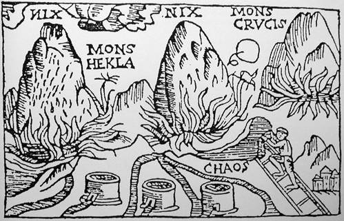 Mais il n'est sans doute pas fortuit que les premières représentations de volcan datent de cette période où les montagnes de feu reçurent enfin un nom. Ce fut au titre de merveille de la nature qu'on vit ainsi l'Etna figurer en 1557 dans le Prodigiorum ac ostentorum chronicon de l'érudit alsacien Conrad Lycosthenes (1518-1561). Entre des ânes portant des pattes sur le dos et des hommes au visage situé au milieu du ventre, la représentation d'une éruption était malgré tout assez fidèle. Plus sobre fut la gravure de l'Hekla, en Islande, que le prélat suédois Olaus Magnus (1490-1557) inséra dans son Historia de gentivm septentrionalium. Dans cet ouvrage, qui est une source d'information des plus précieuse sur le folklore et l'histoire des contrées nordiques, il s'exclama : " Louons cette île pour ses merveilles inhabituelles, en mentionnant en particulier un roc ou un promontoire qui comme l'Etna bouillonne de feux perpétuels. "