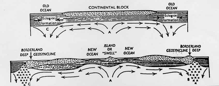 Dès les années 20 ou le début des années 30 il y avait eu les quatre éditions successives de l'ouvrage de Wegener, les travaux de Du Toit, d'Argand, etc. On disposait donc de faits, paléontologiques, géologiques et géophysiques, à partir desquels une interprétation aurait dû conduire à imposer la dérive ; c'est du moins ce que nous pensons, plus d'un demi-siècle après. Et même, une explication théorique était en germe dans l'hypothèse de Holmes qui proposait et même figurait les courants de convection dans le manteau, son dessin les associant clairement à une dérive continentale de part et d’autre d’un océan pourvu d’une dorsale, et qui évoque l’Atlantique (Fig. 3).