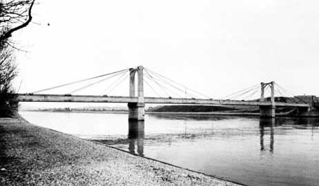 A l'occasion des travaux du même barrage de Donzère, Albert Caquot construisit le premier pont à haubans réalisé en France : cette nouvelle conception s'inspirait, comme toujours, de ses soucis d'économie de matière puisque les efforts horizontaux des haubans sont absorbés dans le tablier, ce qui dispense de la construction des lourds massifs d'ancrage associés aux ponts suspendus. En outre, le tablier de ce pont fut constitué par éléments successifs en encorbellement : ce fut le premier exemple d'une technique qui a été depuis lors très largement appliquée.