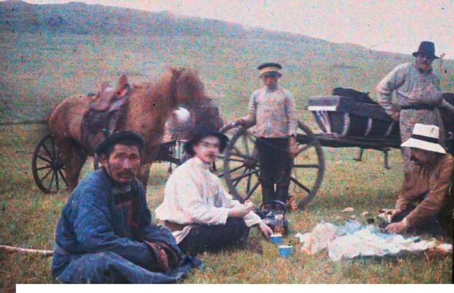 C'est jusque-là que Félix se rendit au court de l'été 1911, en Transbaïkalie à la frontière chinoise, par le Transsibérien qui traverse pendant plusieurs jours consécutifs la steppe russe, si monotone et écrasante de chaleur. Il circula aussi en bateau, et beaucoup à cheval. Il ramena de ce voyage une centaine de plaques photographiques en verre, dont une dizaine en couleurs. [Par le procédé autochrome commercialisé en 1900. Couleur de bonne qualité, et encore très bien conservée en 2009.]