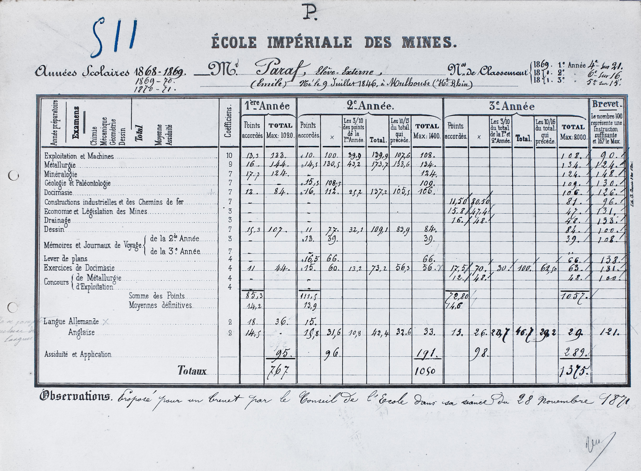 Emile PARAF (1846-1924) appartenait à la promotion 1866 de Polytechnique et était Ingénieur civil des mines (admis le 9/11/1867 classé 17, sorti le 7/6/1870 classé 15)