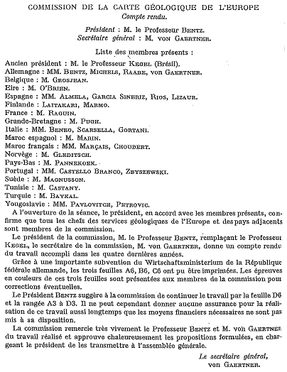Pour la " Carte géologique du Monde ", " Monsieur F. Blondel dit que, comme dans le cas de la Carte Géologique de l'Europe, le travail sur la Carte géologique du Monde a été fait à Berlin [en 1936], et il n'a même pas été possible de faire un rapport au 17e Congrès de Moscou. Il souhaiterait très fortement qu'il y ait une réunion de ce qui reste des membres de la Commission, afin de la réorganiser du fait que beaucoup de ses membres sont morts. Il propose une réunion pour le 30 août à 2h30 p.m. "