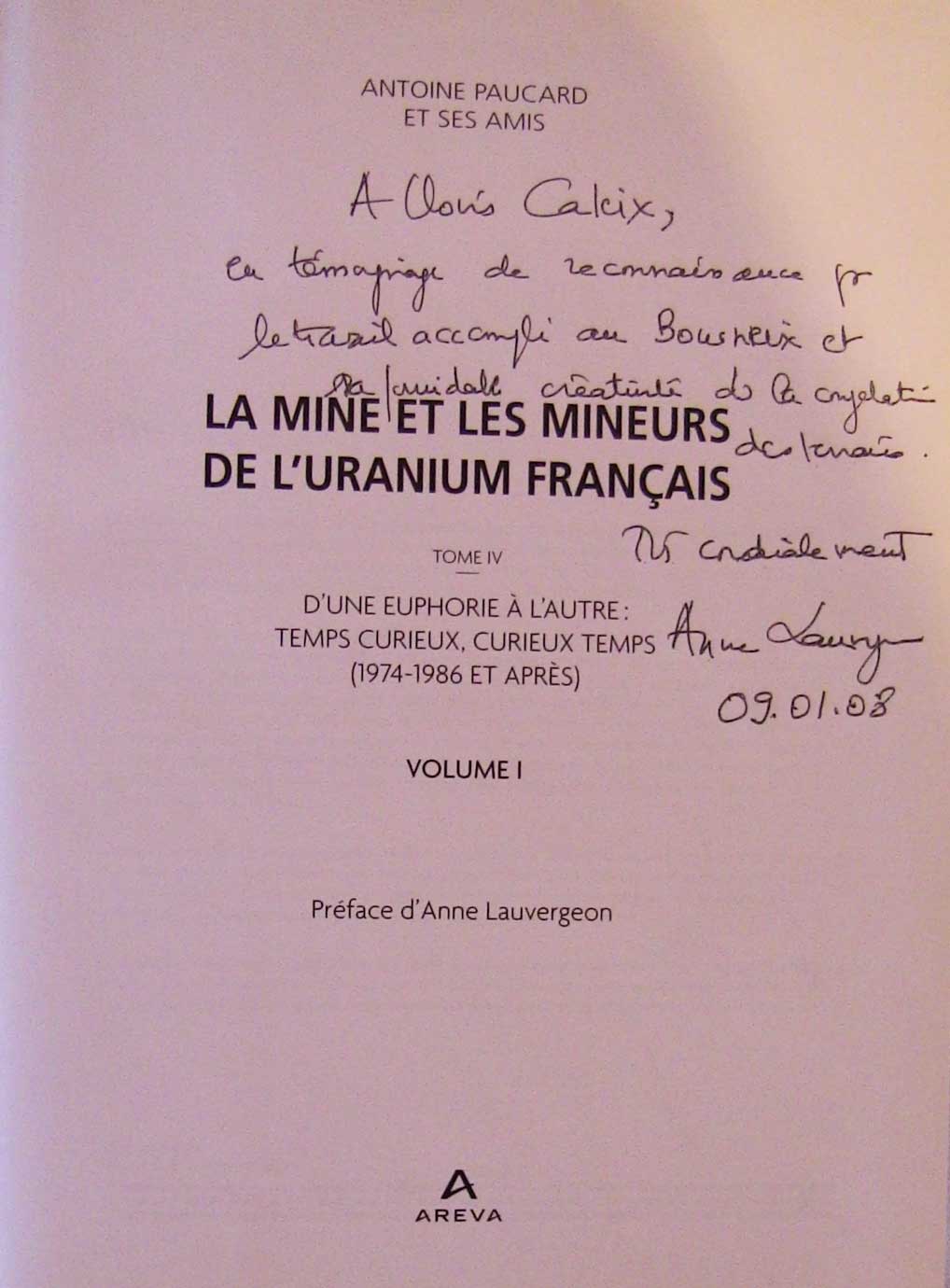 Un livre sur les mineurs de l'uranium, dédicacé à Clovis Caleix par Anne Lauvergeon