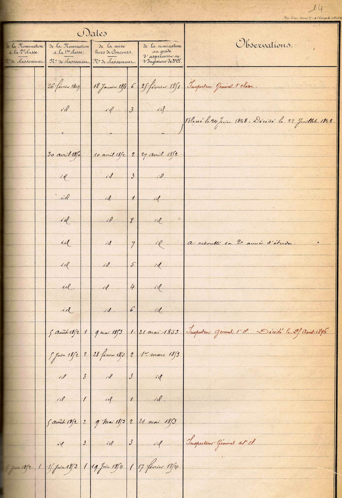 Il est nommé ingénieur en chef tardivement, en 1873, suite à l'intervention personnelle de Eugène Caillaux (1822-1896 ; X 1841), ministre des travaux publics qui était pourtant son adversaire politique (voir Souvenirs, chapitre 10). Inspecteur général de 1ere classe des mines en mars 1886. Il n'a en effet jamais démissionné du corps des mines.